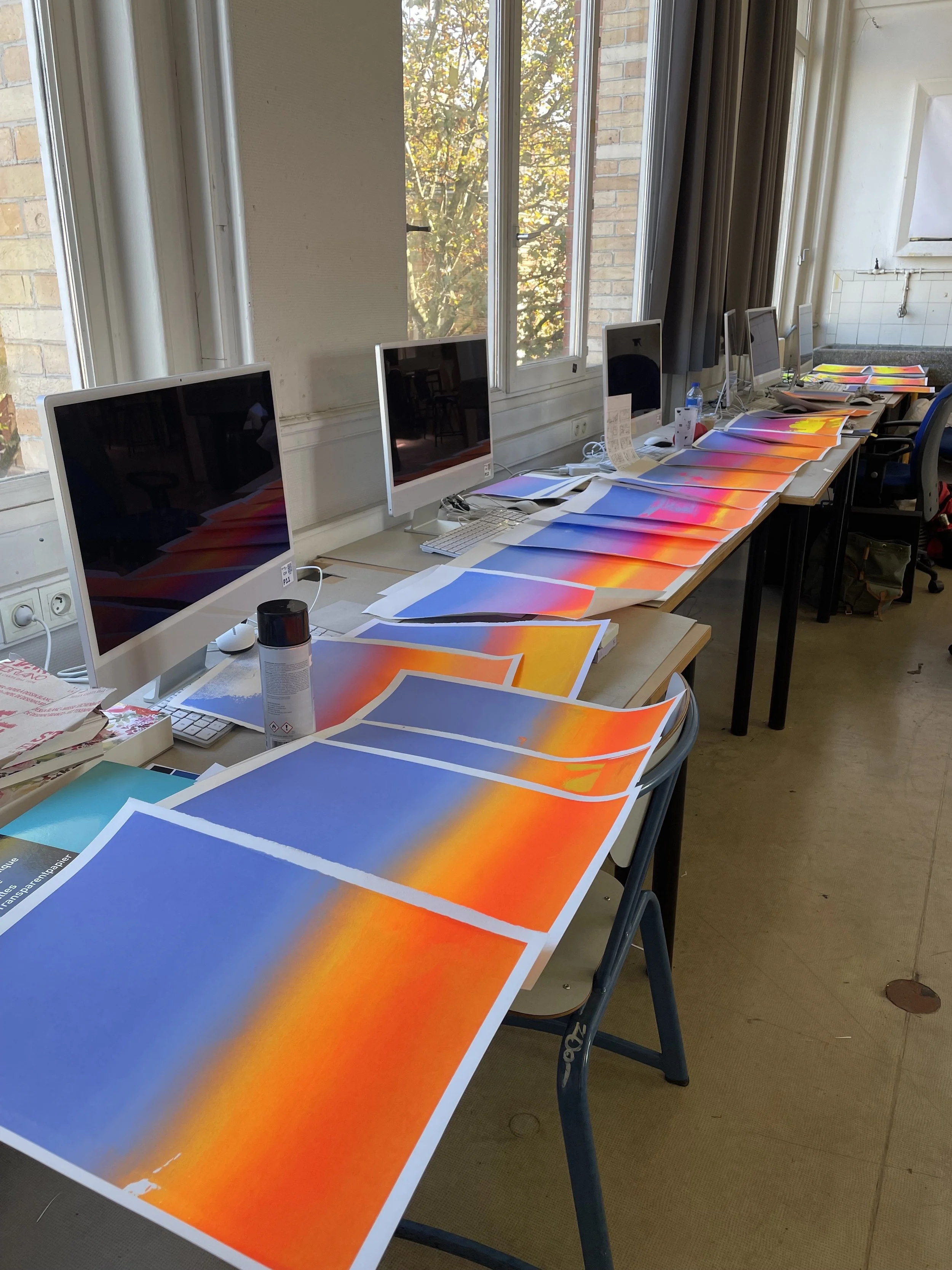 Après plus de 250 tirages en monotype avec une palette de couleurs qui m’est propre et je j’affine depuis 2023, mon message philosophique est niché derrière l’instant présent du geste (passage de la racle) notre choix dans ce process (représenté par la palette) et l’evocation du présent à travers la projection de l’inconscient sur des couleurs typiques des moments les plus intenses de la journée - aurores et crépuscules- ainsi que le passage d’éléments - en parallèle de notre vie - des nuages- des oiseaux- des gloires.